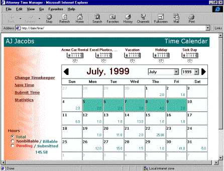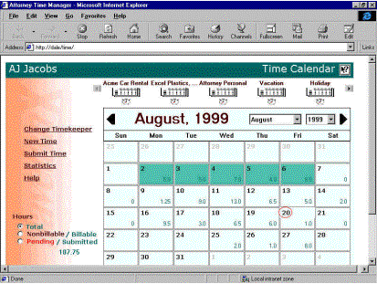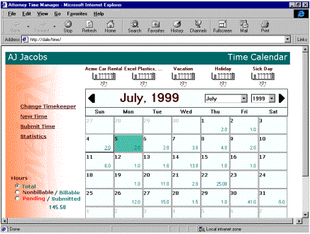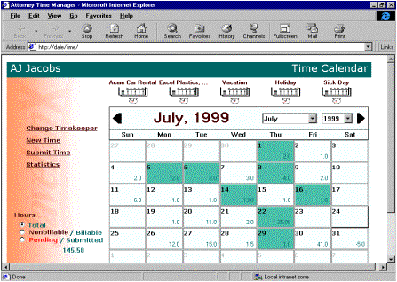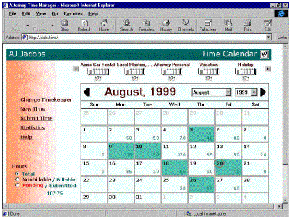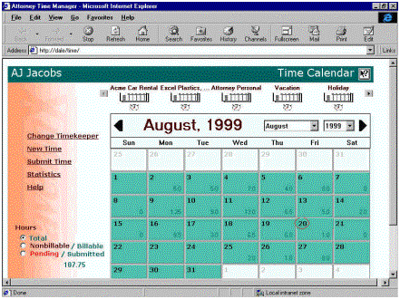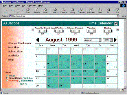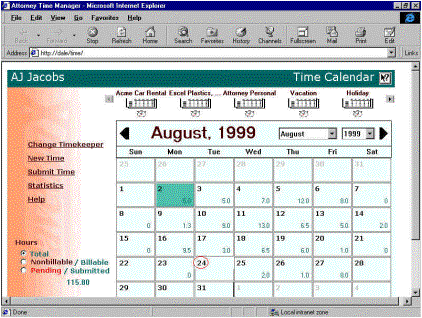 calendar. The timekeeper can choose to see total hours, nonbillable and